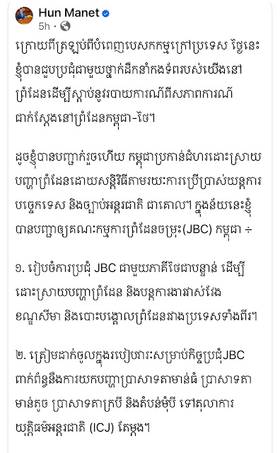 ---Um Sam An ៖ លោក ហ៊ុន ម៉ាណែត មានបំណងចង់លើកយកបញ្ហាប្រាសាទតាមាន់ធំ ប្រាសាទតាមាន់តូច ប្រាសាទតាក្របី និងតំបន់មុំបី ទៅតុលាការយុត្តិធម៌អន្តរជាតិ (ICJ) ។ នេះជាអ្វីដែលកូនខ្មែរ និងខ្មែរគ្រប់និន្នាការនយោបាយចង់បាន ។