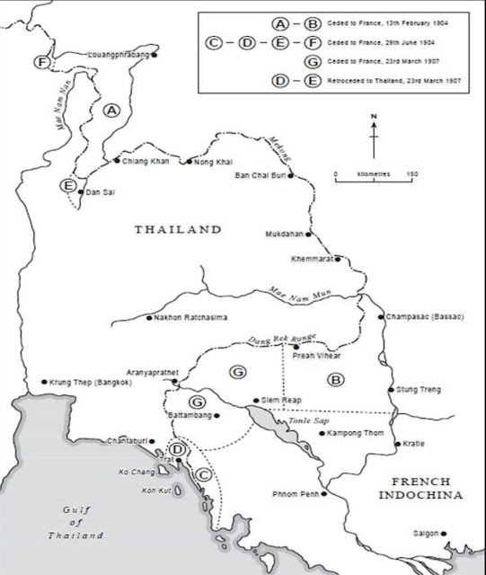 - សន្ធិសញ្ញាបារាំង - សៀម ចុះថ្ងៃទី១៣ ខែកុម្ភៈ ឆ្នាំ១៩០៤ នៅចំណុចⒶ-Ⓑ គឺចំណុចⒶ សៀមបានប្រគល់ក្រុងលួងព្រះបាង្គទៅឱ្យឡាវ និងចំណុចⒷ សៀមប្រគល់ខេត្តព្រះវិហារមកឱ្យកម្ពុជាវិញ។