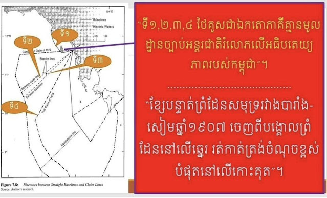 ៧. ចាប់ពីទសវត្សរ៍ទី៧០ កម្ពុជា បានធ្លាក់ទៅក្នុងសង្គ្រាមស៊ីវីល រហូតមក ដោយពុំបានទាមទារលើអធិបតេយ្យភាព នៅលើកោះគុតនោះទេ ។ ហេតុនេះភាគីថៃ ឆ្លៀតឱកាសគូសផែនទីជាឯកតោភាគីលើកទី១ គូសក្រឡឹងយកកោះគុត, លើកទី២ គូសចេញឆ្ងាយចូលមកក្នុងដែនសមុទ្រខ្មែរ, លើកទី៣ គូសចូលបន្ថែមទៀត និងលើកទី៤ ខ្សែបន្ទាត់ឆ្នាំ១៩៧៣ ថៃបានគូសចូលកាន់តែជ្រៅនៅក្នុងផែនសមុទ្រខ្មែរ ដោយគ្មានមូលដ្ឋានច្បាប់អន្តរជាតិឡើយ។ ការគូសយកដែនទឹកខ្មែរជាបន្តបន្ទាប់នេះ ដោយសារភាគីកម្ពុជា ពុំបានតវ៉ាឱ្យបានខ្លាំងក្លា។