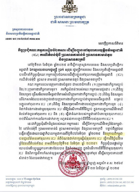 «កម្ពុជាបានជូនព័ត៌មានទៅតុលាការ ICJ ពីបំណងដាក់ពាក្យស្នើសុំតុលាការ ICJ ធ្វើការវិនិច្ឆ័យវិវាទព្រំដែនលើតំបន់ទាំង៤» នេះបើយោងតាមសេចក្តីប្រកាសព័ត៌មានរបស់ក្រសួងការបរទេសកម្ពុជា នៅថ្ងៃនេះ។